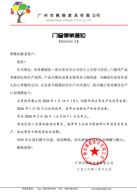 年关将近,2026年1月14日前报单,均能年前正常生产及送货安装。2026年1月15日后报单,在年后安排生产和送货安装。