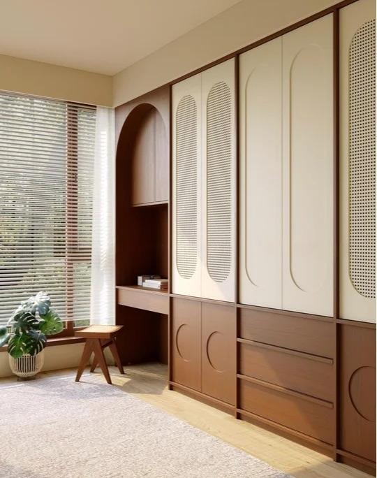 奶油风衣柜设计核心要求(温柔治愈 + 实用耐看) 奶油风核心是柔和、温润、低饱和度、无锐角,衣柜设计要兼顾颜值与收纳,同时适配奶油风整体家居调性,以下是分维度关键要求: 一、风格与色彩要求(奶油风灵魂) 1. 核心色彩 主色:奶白、米白、奶油白、浅杏、浅奶咖(首选,温柔不刺眼) 辅色:浅灰、原木色(浅橡木 / 白橡木)、浅奶茶色(≤2 种,避免杂乱) 禁忌:高饱和色(红、黄、蓝)、纯黑、深棕、金属冷色(除非做极少量点缀) 配色公式: 纯奶油系:奶白柜体 + 奶白门板(同色更显温柔) 奶油 + 原木:奶白柜体 + 浅原木门板 / 开放格(增加温暖感) 奶油 + 浅灰:奶白柜体 + 浅灰门板(更显高级,耐脏) 2. 造型风格 线条:极简直线 + 圆弧过渡(拒绝复杂雕花、罗马柱、复杂造型) 门板:平板门为主,可做圆弧门板 / 圆弧转角(弱化锐角,更显柔和) 比例:宽高比协调,避免过窄过高的单扇门(易变形、开合不顺) 视觉:通顶设计优先(显层高、整洁,减少积灰),顶部做同色封板,与吊顶无缝衔接 二、材质与工艺要求(质感 + 耐用) 1. 柜体材质 首选:实木多层板 / 欧松板(OSB)+PET 奶油白饰面(环保、防潮、质感细腻,无甲醛隐患) 次选:实木颗粒板(E0 级)+ 双饰面奶油白(性价比高,适合预算有限) 避坑:密度板(易变形、受潮)、劣质饰面(易发黄、刮花) 2. 门板材质(奶油风关键) 首选:PET 门板(奶油白 / 浅奶咖):表面光滑、抗污、耐黄变,哑光质感最贴合奶油风 次选:吸塑门板(哑光):可做圆弧造型,性价比高,适合做复杂线条 备选:实木门板(浅原木 / 奶白烤漆):质感高级,预算充足可选,需做防潮处理 工艺:全封边(PUR 封边):防水、防翘边,缝隙≤2mm,同色封边更美观 ​​​​​​​