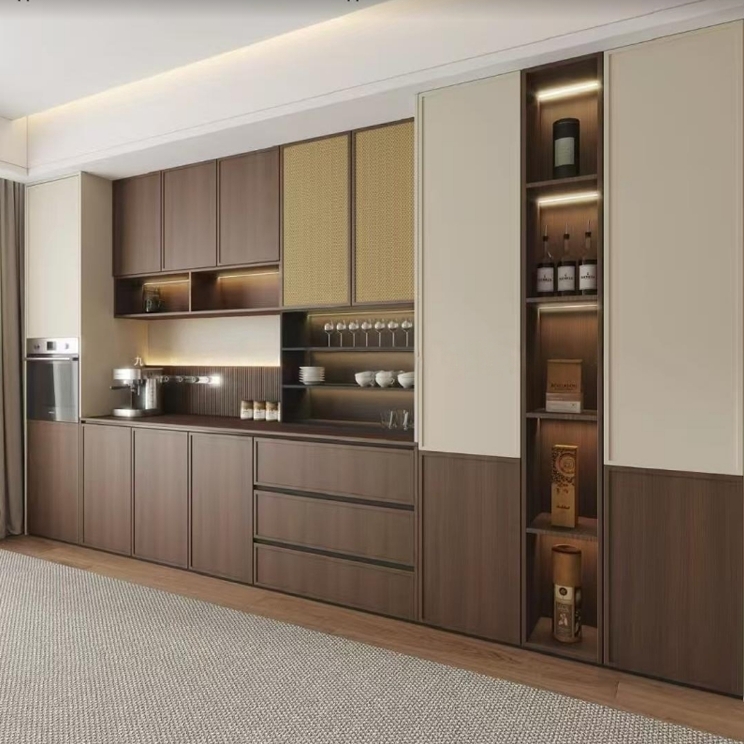 功能实用,分区合理,封闭柜 + 开放格 + 抽屉兼顾收纳与展示,可放餐具、小家电、酒水。