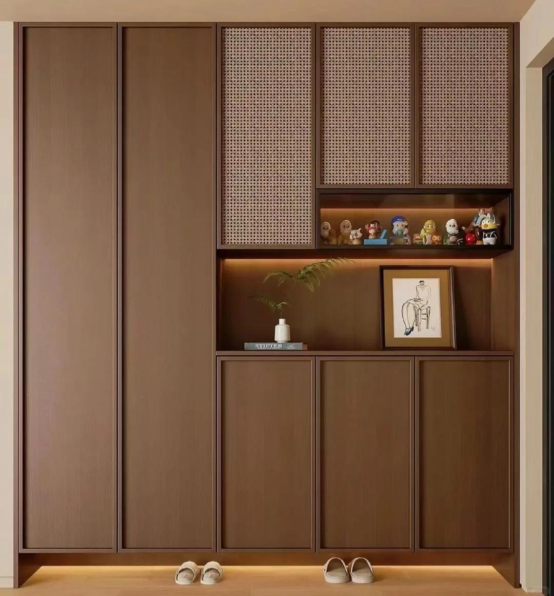 细节自带复古亮点:黄铜金属拉手、长虹玻璃、格栅门、藤编元素,提升精致度。