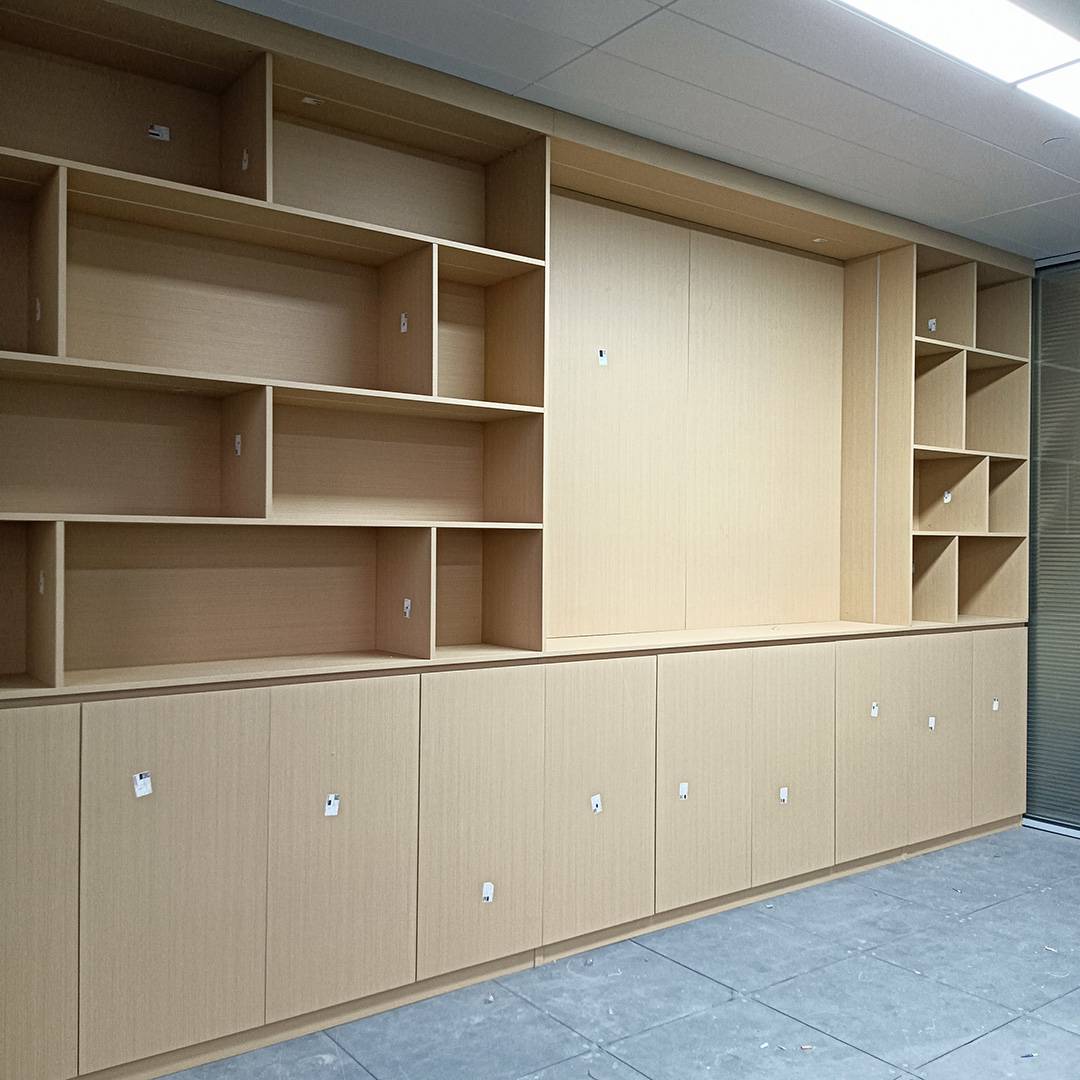 办公室背景柜首先是存储功能。办公室文件、资料众多,背景柜提供了充足的收纳空间,可以分类存放各类文档、办公用品,让办公空间更加整洁有序,避免文件杂乱堆放,提高工作效率。