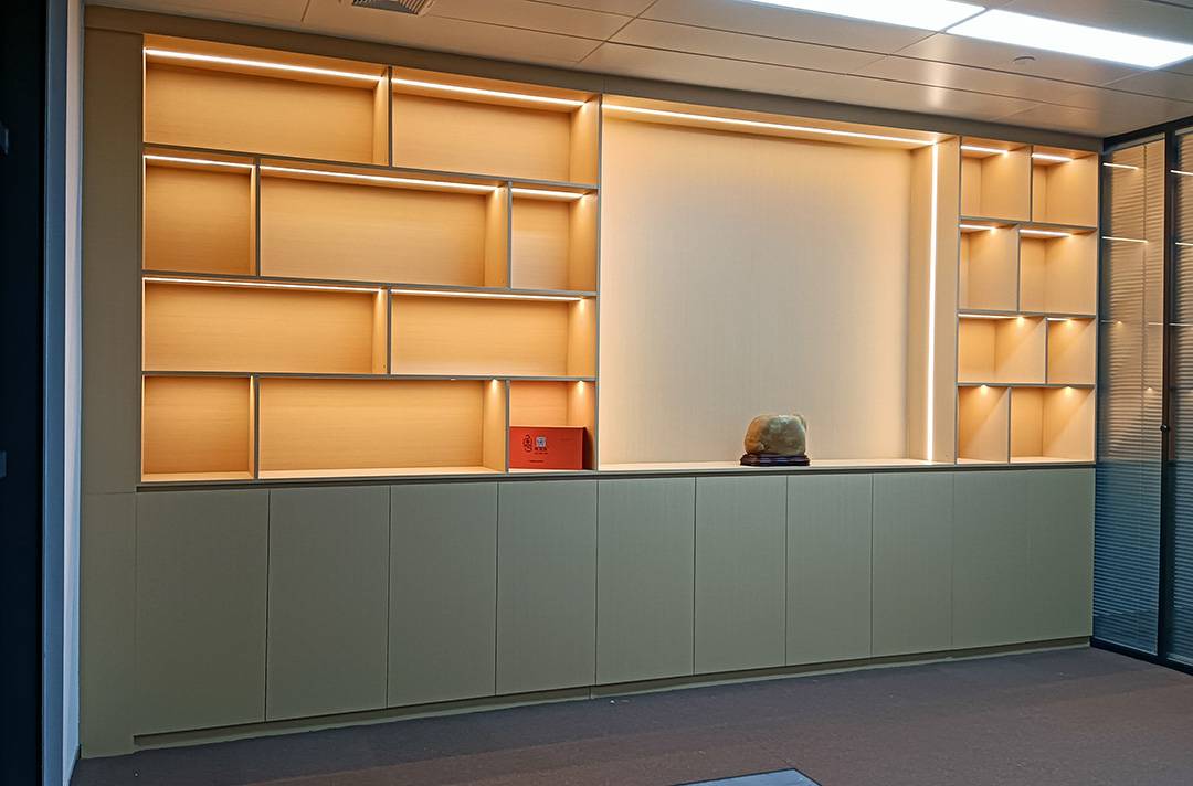 背景柜的材质也是多样的,板木、金属、玻璃......或单一简洁或相互结合,配以灯光给人一种高端大气的感觉。广州枫格家具制造产品价格是亲民的,可以满足不同企业老板的所需。