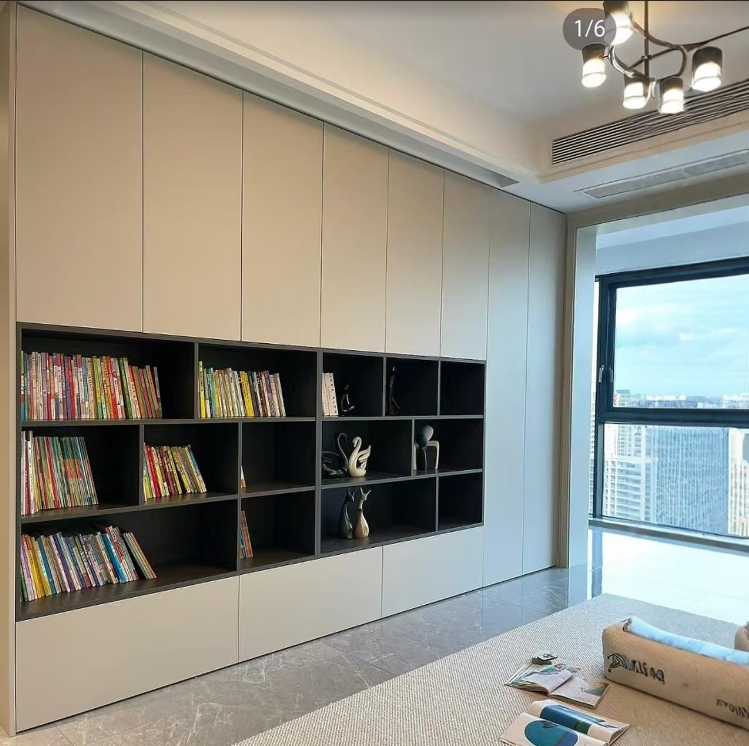 - 柜门、抽屉选用缓冲铰链或滑轨,开关静音且防夹手;开放式格架高度适配日常拿取物品的抬手高度。