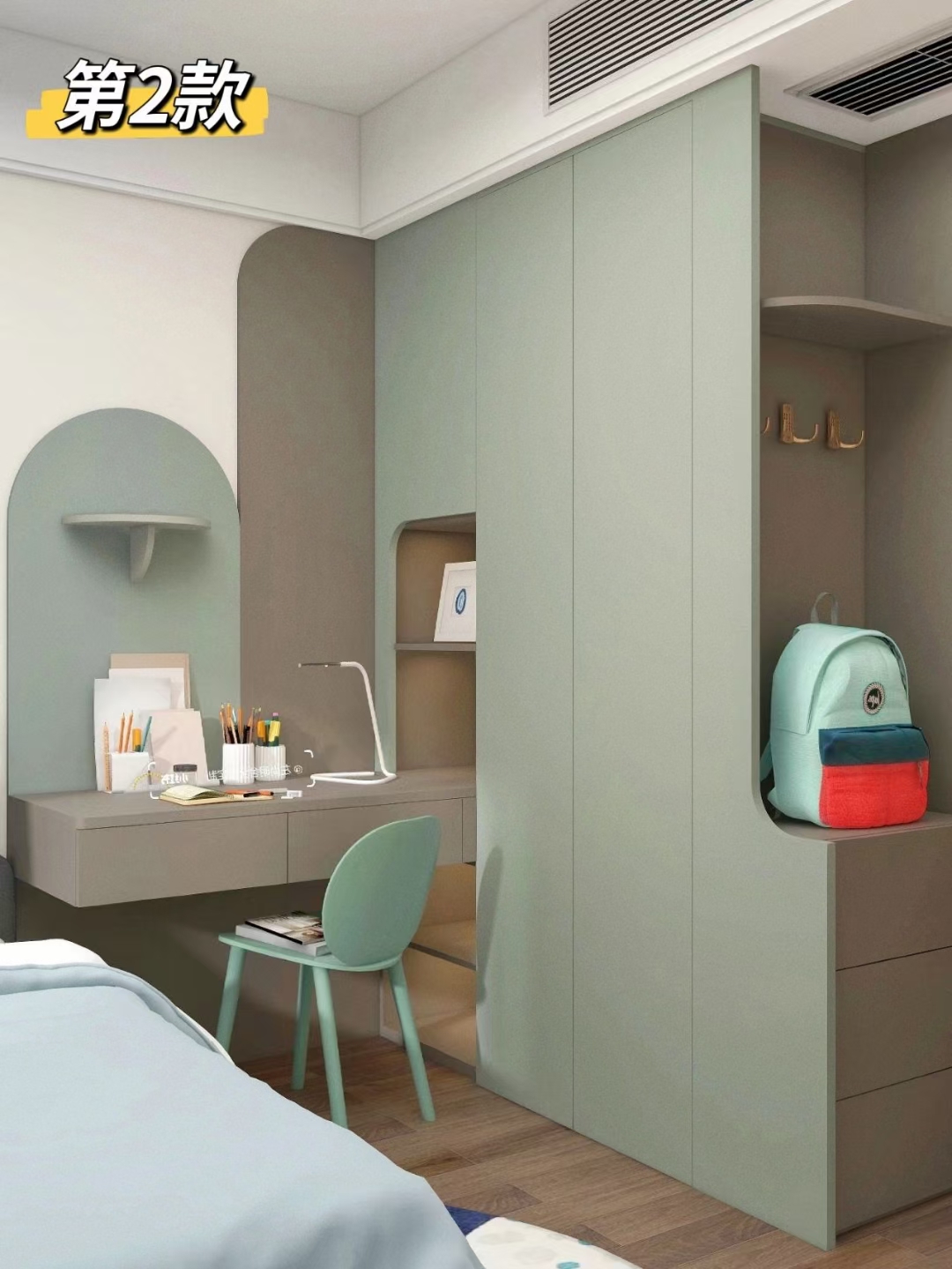 布局遵循实用留白原则,预留充足活动空间,床、书桌、衣柜采用紧凑组合式设计,避免拥挤。色彩以柔和浅色系为主,保护视力,可少量点缀亮色增添童趣,不做过于花哨易过时的造型。