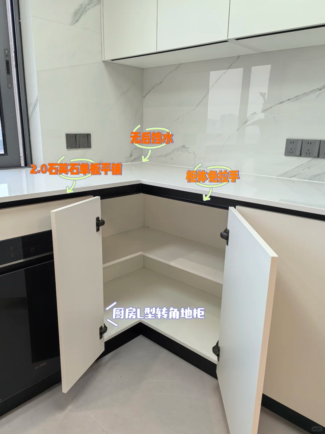 5. 细节设计:加装抽屉分隔件、拉篮、转角飞碟等五金件提升储物效率;台面做挡水条防积水;吊柜底部装感应灯补充照明;烟机与灶台的距离控制在65-75cm。