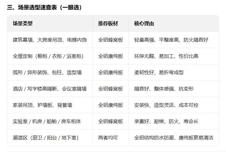 - 要「家居定制、快装、异形、环保、性价比」 → 选 全铝康纯板