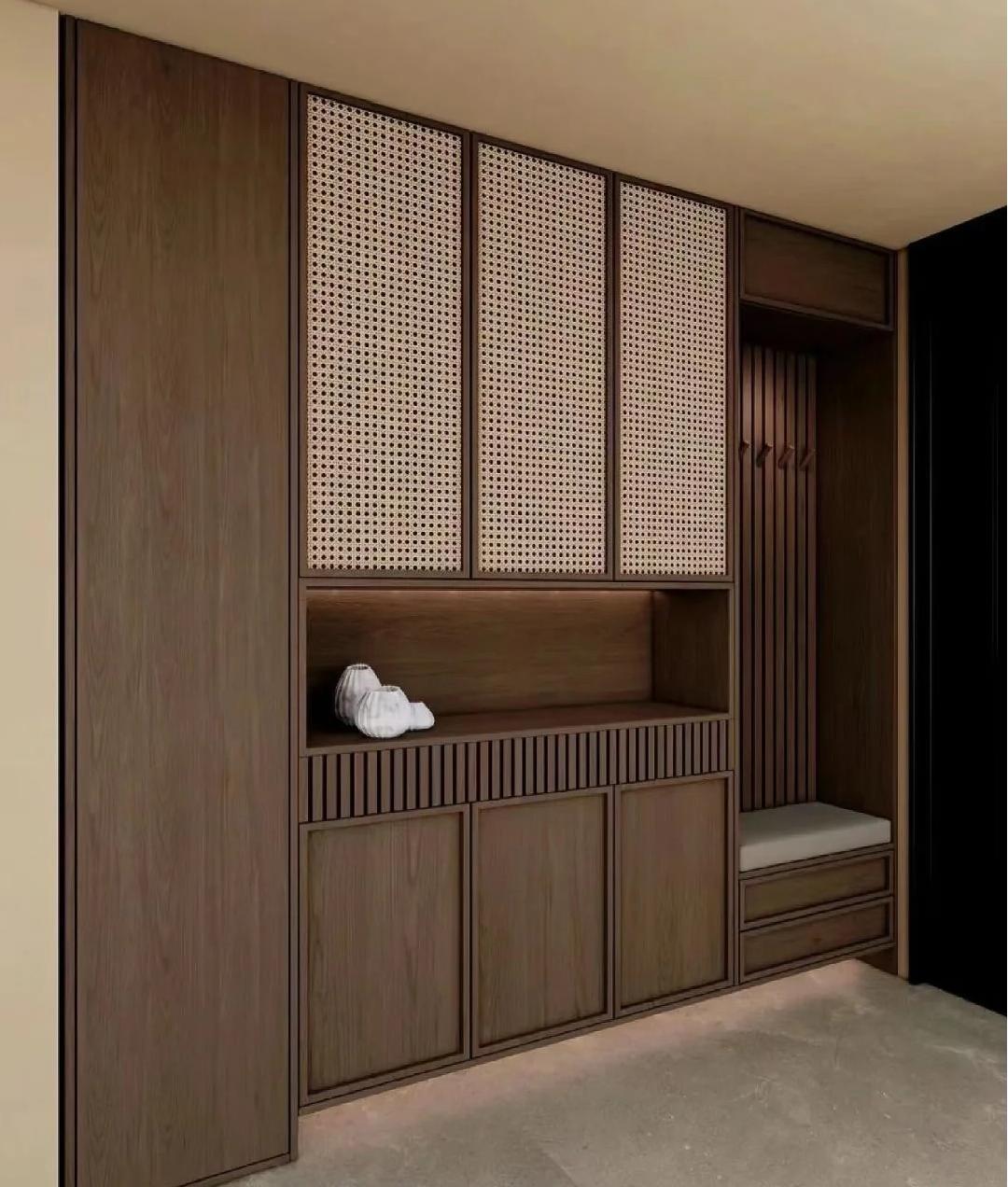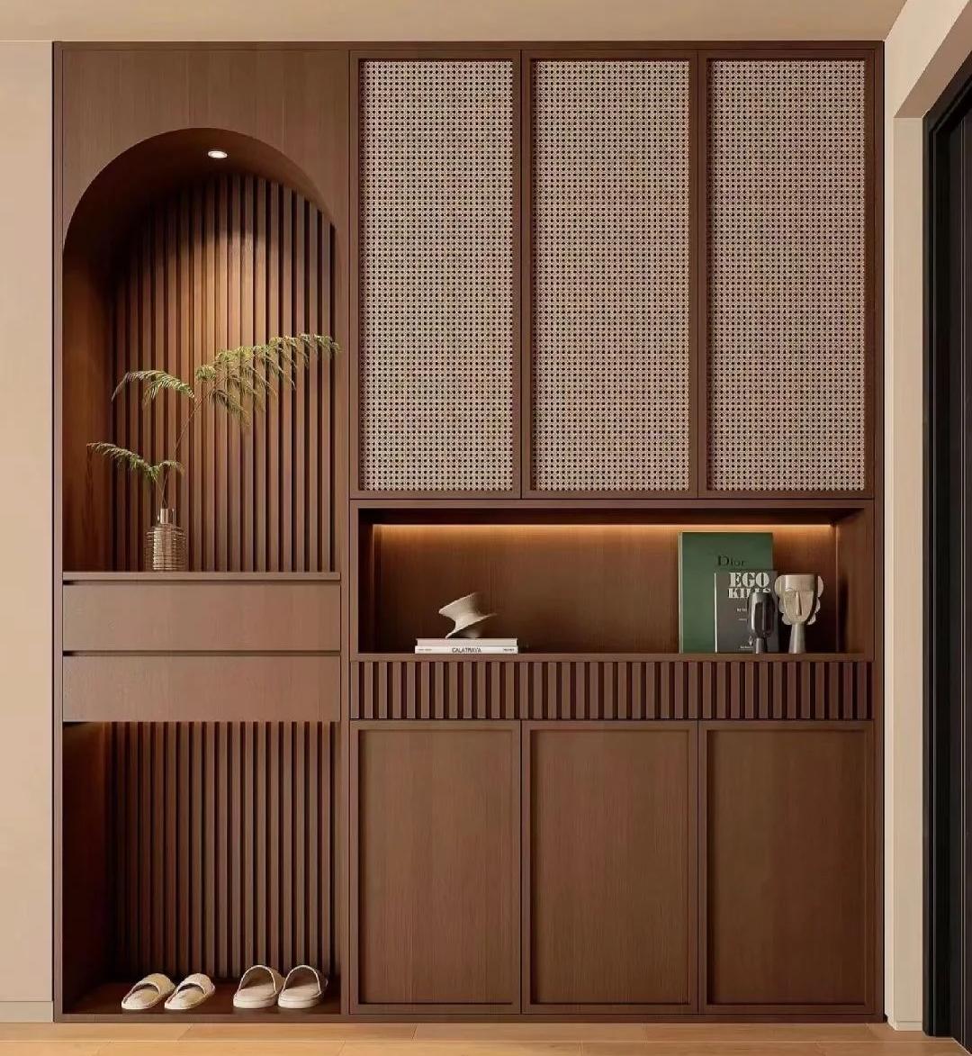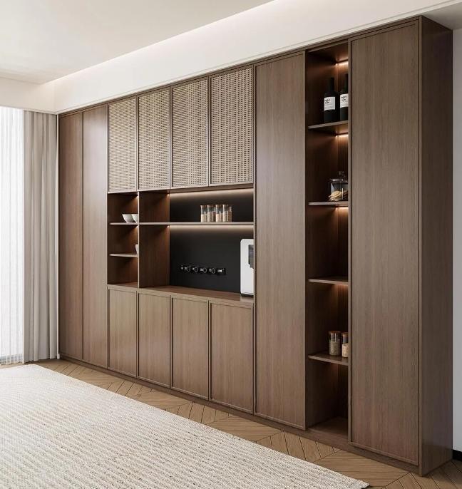 细节自带复古亮点:黄铜金属拉手、长虹玻璃、格栅门、藤编元素,提升精致度。