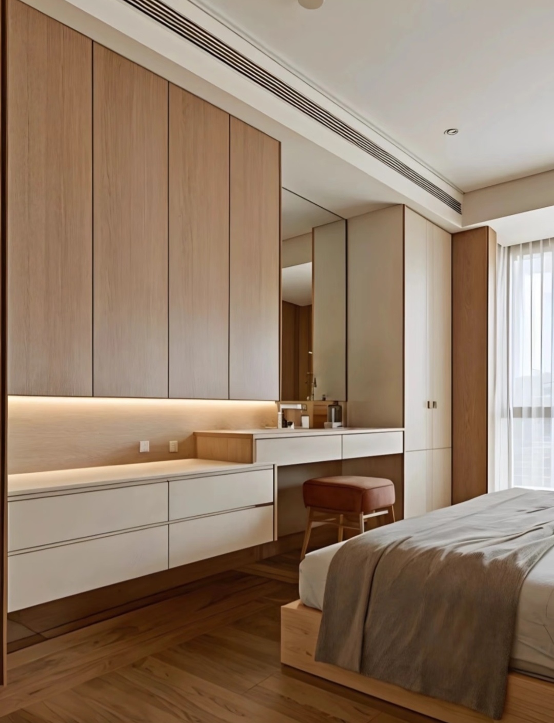 原木风核心是回归自然、温润质朴、低饱和度、线条简洁,衣柜设计要兼顾材质质感、收纳功能、空间氛围,拒绝过度装饰,突出木材本身的肌理与温度。