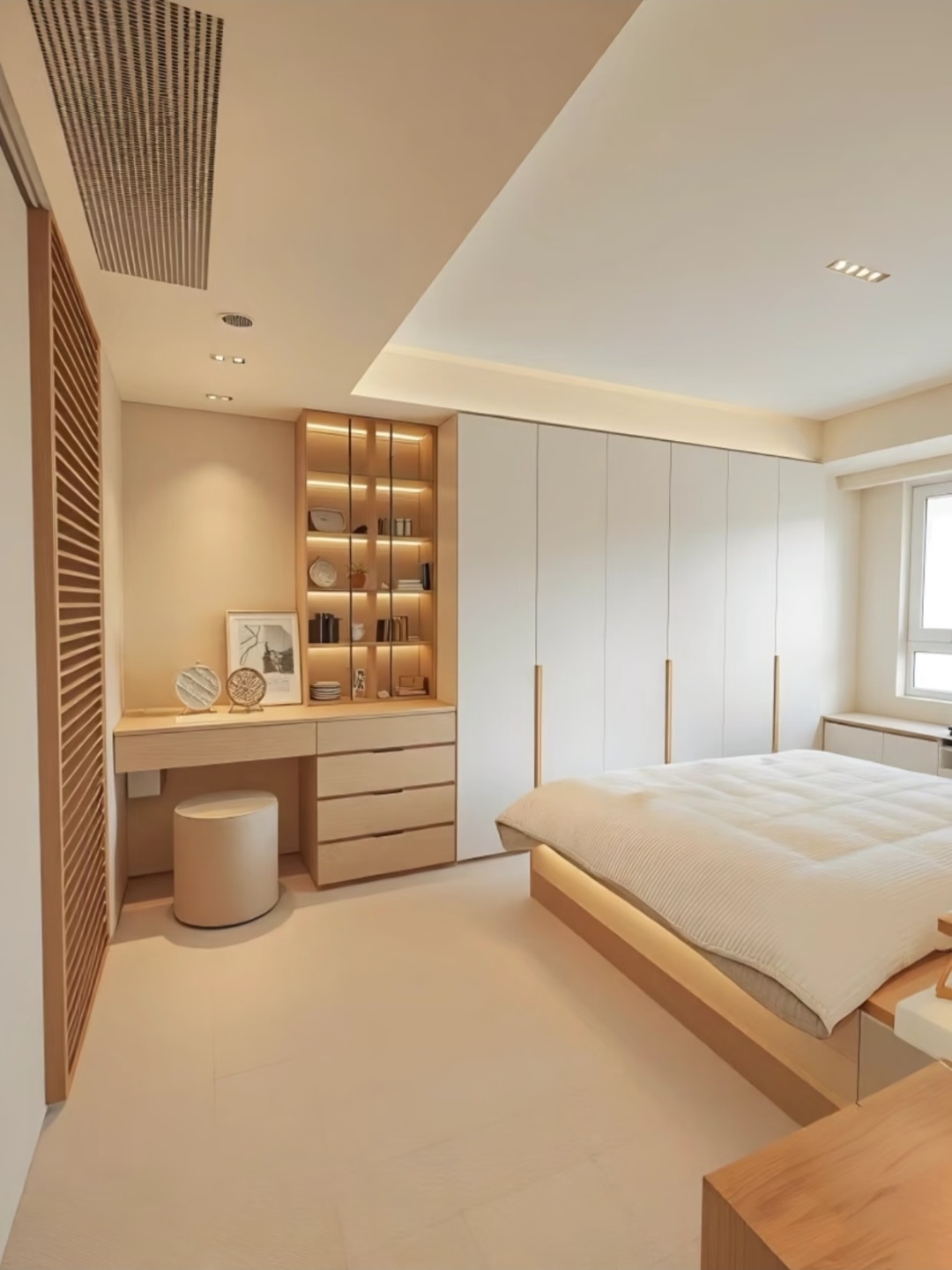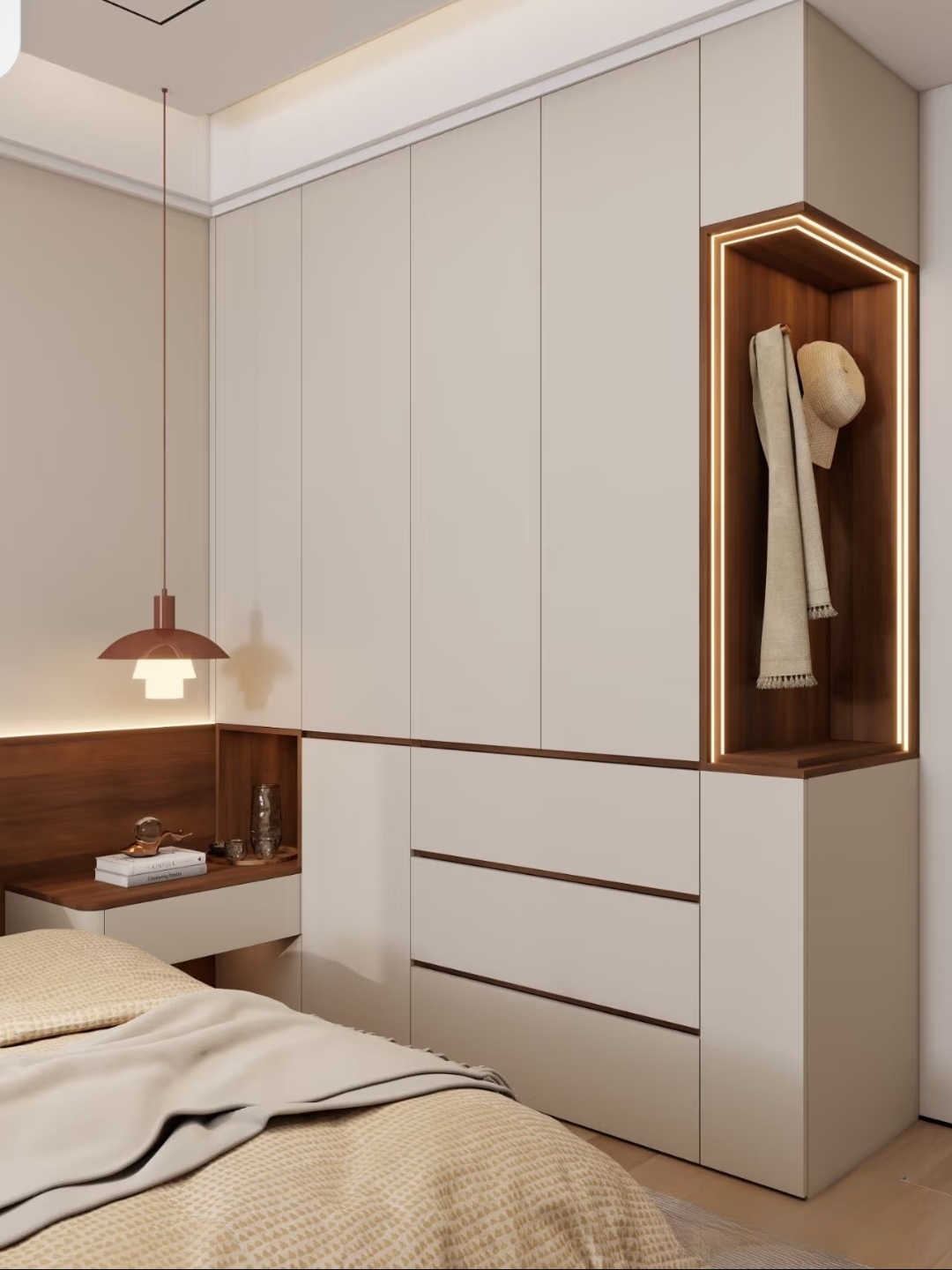 比例:通顶设计优先(显层高、整洁,减少积灰),顶部做同木色 / 奶白封板,与吊顶无缝衔接
