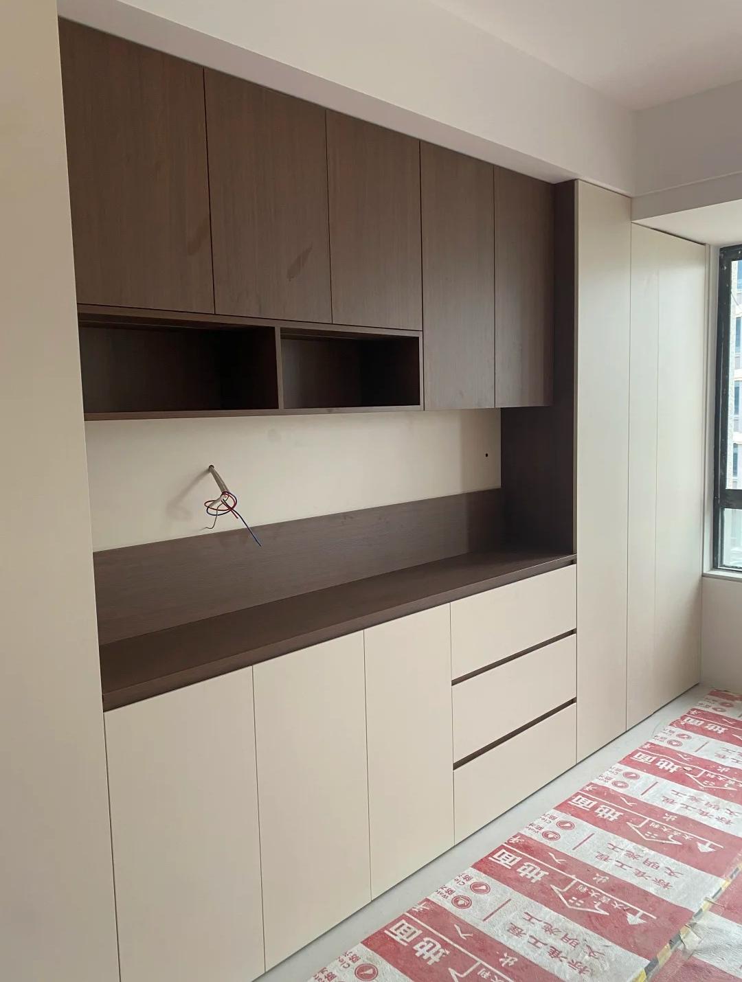 原木 + 奶油:原木柜体 + 奶白门板(柔和治愈,适合小户型 / 奶油原木风)