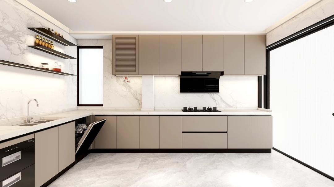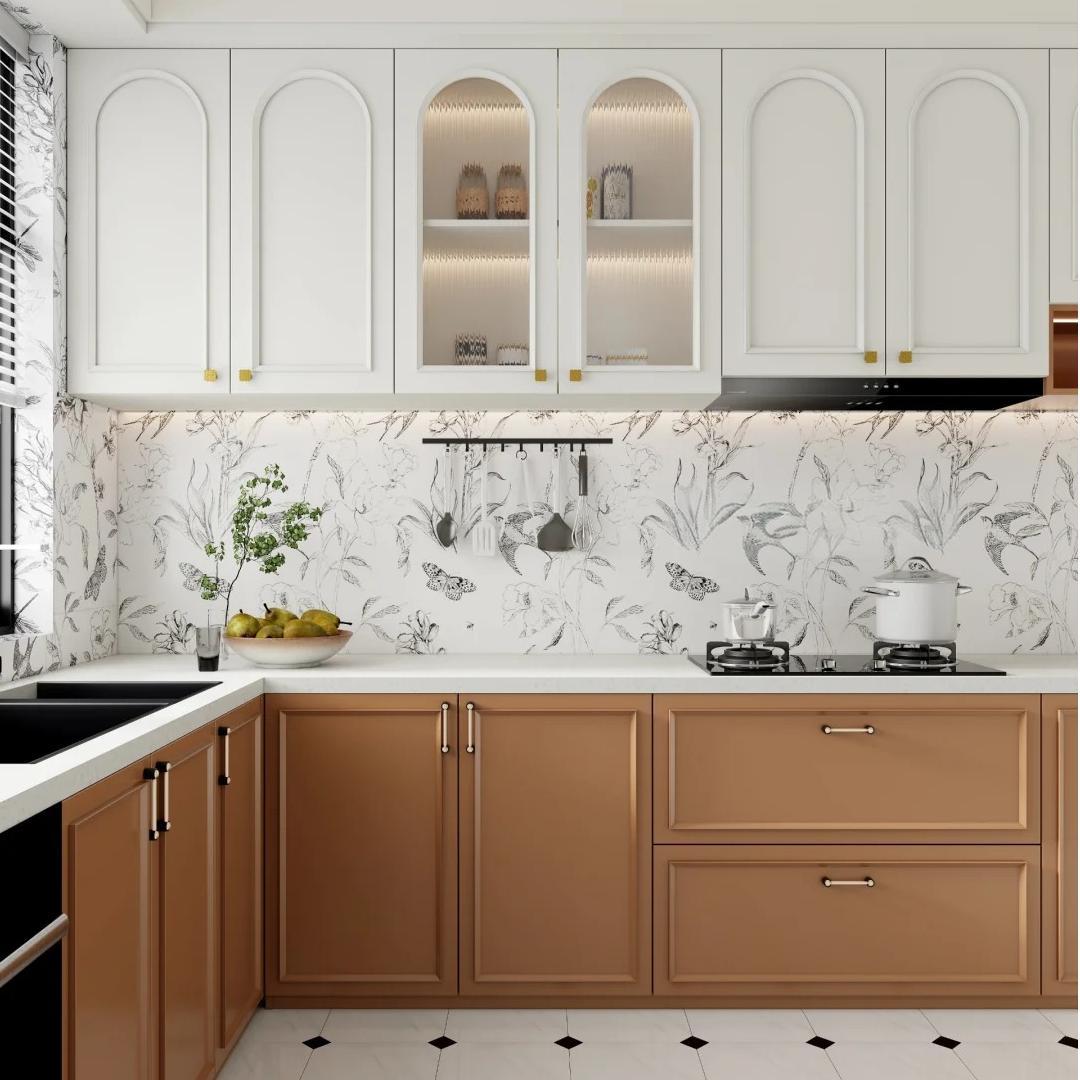 3. 功能分区:明确划分储物区(碗碟、食材、小家电)、洗涤区(水槽+净水装置)、烹饪区(灶台+烟机),预留电器嵌入位(冰箱、烤箱、洗碗机等)并匹配电源接口。
