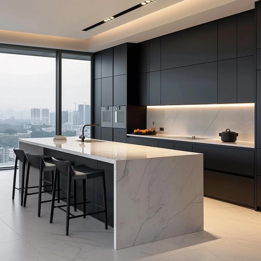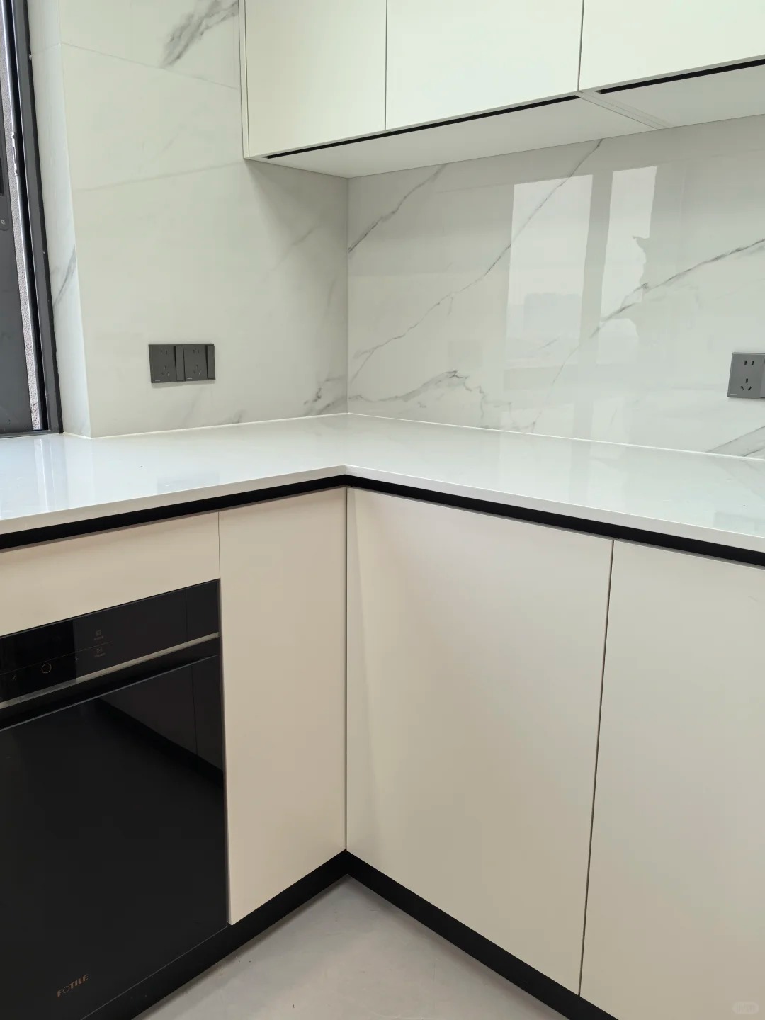 4. 材质选择:柜体优先选防潮、环保的多层实木板或海洋板;台面用石英石(耐磨耐污)或岩板(耐高温);柜门可选PET门板、烤漆门板或实木门板,兼顾颜值与耐用性。